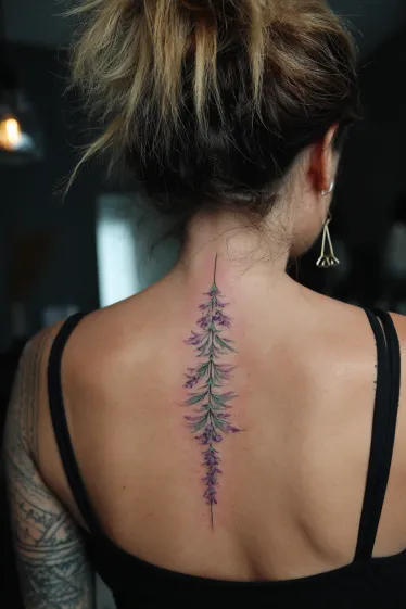This exquisite tattoo showcases a delicate arrangement of lavender sprigs, their tiny purple florets and slender green leaves gracefully ascending the spine. The design is rendered with a soft, natural touch, giving each cluster of lavender a gentle, almost ethereal appearance. The way the stems subtly weave and stretch creates a beautiful, continuous flow that perfectly accentuates the elegant line of the back.
