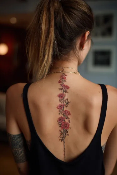 Honestly, I absolutely adore how classic and beautifully feminine this rose vine tattoo is! The rich pinks of the roses are just so captivating, and the way they bloom and trail down the spine feels incredibly romantic and graceful. It’s such a lovely way to celebrate enduring beauty and strength, and I think it would make anyone feel wonderfully elegant and confident with this stunning floral art.