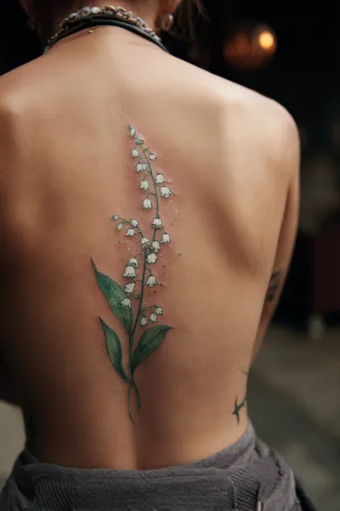 This exquisite tattoo features a delicate cascade of lily of the valley flowers, their tiny white bells and vibrant green leaves gracefully ascending the spine. Each bell-shaped blossom is intricately detailed, giving the entire design a wonderfully fresh and subtle beauty. The slender stems and flowing arrangement create an organic and elegant look that perfectly complements the graceful curve of the back.