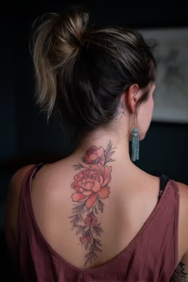 This exquisite tattoo features a delicate cascade of soft pink peony-like flowers, gracefully blooming along the spine. Each blossom is intricately detailed with tender petals and subtle shading, beautifully complemented by muted grey-green leaves that create a harmonious, flowing vine. The entire design has a wonderfully organic and serene feel, perfectly accentuating the elegant line of the back with its gentle charm.
