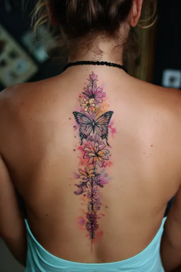 This enchanting spine tattoo features a beautifully detailed butterfly with delicate black outlines, its wings bursting with vibrant splashes of pink, purple, and yellow watercolor. Both above and below the butterfly, a charming cascade of wildflowers in complementary hues creates a dreamy and artistic flow. The entire design feels wonderfully organic and whimsical, perfectly accentuating the elegant line of the back.