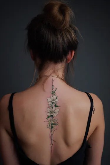 This exquisite tattoo showcases a delicate trail of white blossoms and lush green foliage, gracefully ascending the spine. Each flower is intricately detailed with soft shading, giving them a wonderfully ethereal and almost translucent appearance, while the slender stems and subtle hints of leaves create an organic and flowing design. The entire piece has a serene and elegant feel, perfectly complementing the graceful curve of the back with its gentle charm.
