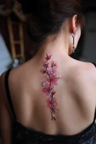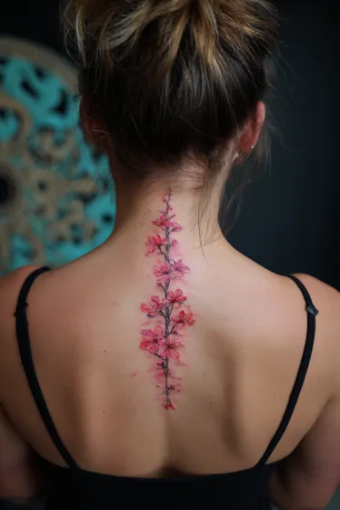 This absolutely enchanting spine tattoo features a slender branch adorned with delicate pink blossoms, gracefully tracing a path down the entire length of the spine. The flowers have a soft, almost watercolor-like quality with subtle hints of darker pink and lighter tones, giving them a very natural and airy feel. The branches themselves are thin and elegant, allowing the vibrant blossoms to be the star of this beautiful, elongated design.