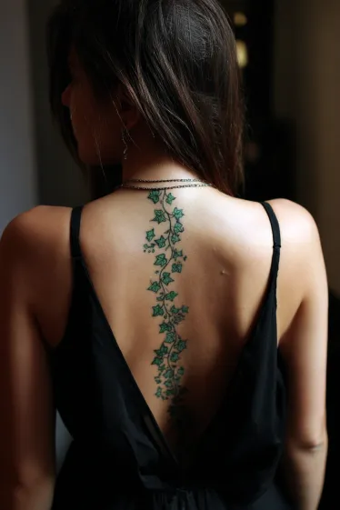 This enchanting spine tattoo features a beautiful, winding vine of ivy leaves that gracefully trails down the entire length of the back. Each leaf is detailed with lovely shades of green, giving the design a natural and organic feel, almost as if real ivy is growing along the spine. The way the leaves are arranged creates a flowy, delicate pattern that truly highlights the natural curve of the back.