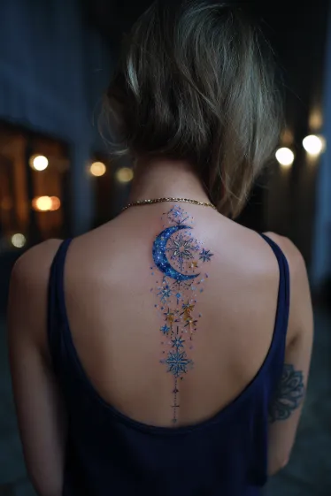 This enchanting spine tattoo showcases a vibrant crescent moon at the very top, shimmering with gorgeous shades of blue and purple. Below it, a breathtaking cascade of celestial elements gracefully extends down the spine, featuring various sizes and styles of sparkling stars in glittering blues, golds, and purples. They are all connected by delicate lines and tiny dots, creating a stunning, flowing cosmic journey right down the back.