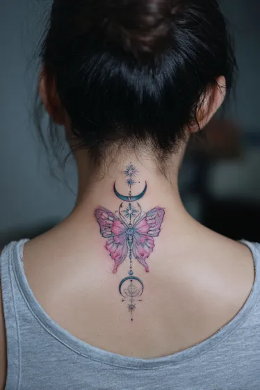 This delicate spine tattoo centers around a beautifully rendered butterfly with wings showcasing soft shades of pink and purple. Above and below the butterfly, elegant crescent moons, sparkling stars, and intricate dot work create a celestial pathway along the back. The entire design has a harmonious, symmetrical feel with a touch of whimsy.