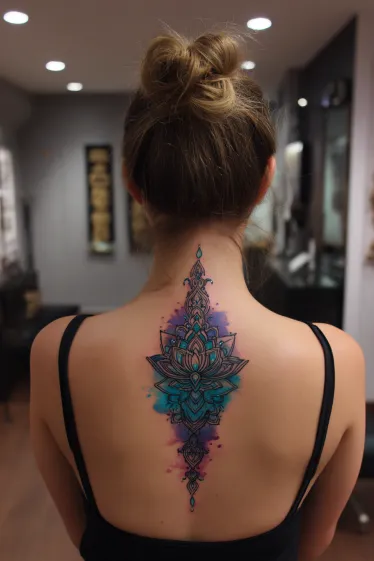 I am completely smitten with this tattoo. The combination of the precise mandala details with the soft, flowing watercolor is just pure art, making it feel both grounded and otherworldly. It is such a powerful symbol of purity and enlightenment, and seeing it flow so gracefully down the spine is truly inspiring. This design would make anyone feel centered, beautiful, and utterly unique, it is a real showstopper!