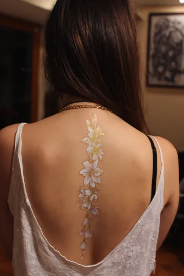 This absolutely enchanting spine tattoo features a cascade of delicate white flowers, possibly lilies or similar blossoms, intertwined with subtle golden accents that gently trail down the length of the back. The petals have a soft, almost translucent quality, giving the entire design a very ethereal and graceful feel. It is a stunning, elongated floral vine that beautifully highlights the natural curve of the spine.