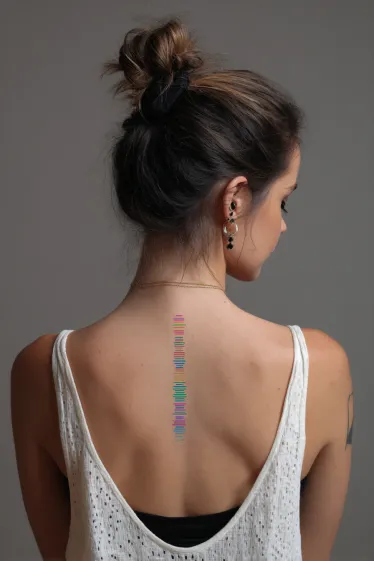 This incredibly unique spine tattoo features a series of short, horizontal lines in a stunning spectrum of colors, running vertically down the back. It totally gives off cool equalizer or sound wave vibes, with each line boasting a different hue from pinks and purples to blues and greens. The delicate placement and vibrant yet understated colors make it a really modern and captivating piece.