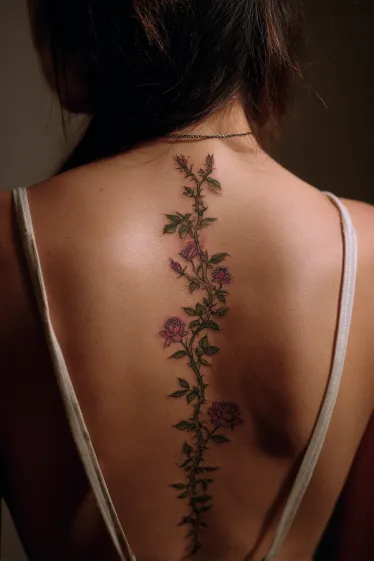 This exquisite tattoo showcases a delicate and continuous vine of vibrant pink roses, gracefully ascending the spine. Each rose is intricately detailed with soft pink petals and rich shading, while slender, thorny stems and subtle green leaves interlace to create a truly organic and flowing design. The entire piece has a timeless and elegant feel, perfectly complementing the graceful curve of the back.