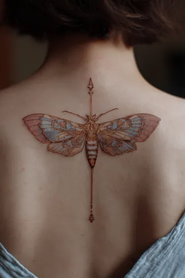 This absolutely breathtaking spine tattoo features a stunning moth design, rendered with incredibly fine details and a beautiful blend of soft pastel blues, pinks, and warm earthy tones. The moth’s body and intricate wings are adorned with delicate patterns that give it an almost regal, antique feel. Extending both upwards from its head and downwards from its tail is a slender, ornate line with decorative elements, perfectly following the curve of the spine.