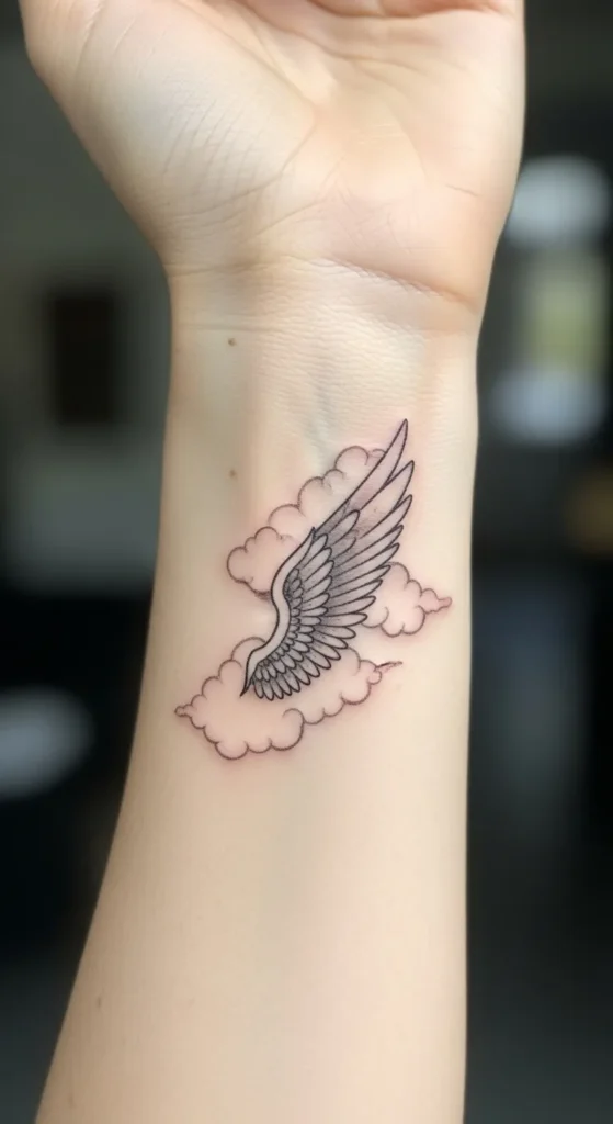 This design showcases a single, detailed angel wing nestled within soft, puffy clouds on the inner wrist. The style uses fine black lines and subtle grey shading to give the feathers a realistic texture while keeping the surrounding clouds light and airy. It is a medium-sized ink that blends the boldness of the wing with the softness of the background. The lack of heavy color makes it a versatile choice that looks clean and sophisticated against the skin.