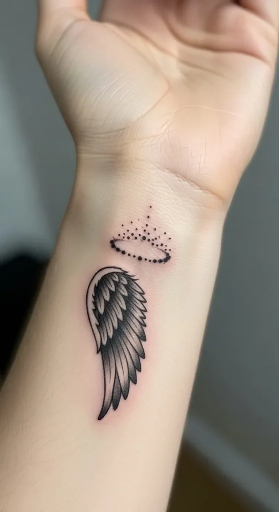 This tattoo showcases a solitary angel wing paired with a minimalist halo made of delicate dots. The wing is rendered in a soft black and grey shading style that gives the feathers a realistic yet velvety texture. It is a medium-sized piece that merges bold outlines with fine detail in the plumage. The halo floats just above the wing in a stippled or pointillist effect, which adds a modern twist to a classic symbol. The placement is perfect for a visible reminder that wraps slightly around the wrist area.