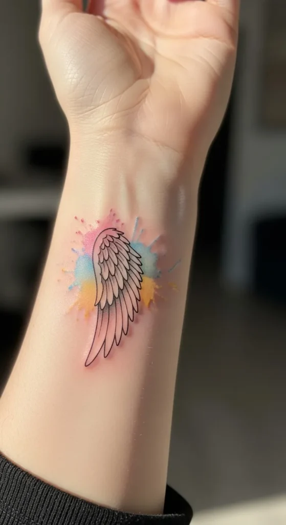 This colorful piece transforms the inner forearm into a canvas for a single angel wing outlined in crisp black ink. The feathers are detailed with subtle grey shading to give them depth, while a playful burst of watercolor splashes out from behind the wing. You have a beautiful mix of pastel pink, sky blue, and golden yellow that looks like it was flicked onto the skin with a paintbrush. It is a medium-sized design that mixes the clean lines of the wing with the messy and artistic vibe of the color drops.