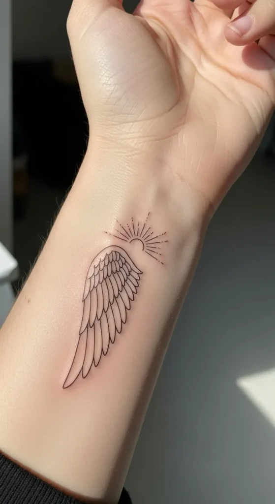 The combination of a wing with a rising sun feels like a fresh start or a personal symbol of hope that I find really moving. Having that little burst of sunshine peeking out from the feathers makes the whole look feel bright and optimistic instead of just a standard angelic tribute. It looks like a little piece of art that would catch the light perfectly while you are grabbing your morning coffee.