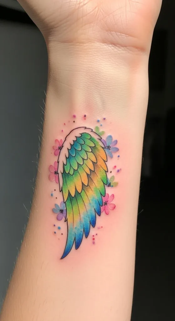 This vibrant tattoo showcases a single angel wing bursting with a full spectrum of colors on the inner wrist. The design uses a watercolor technique where bright greens, yellows, and blues blend seamlessly into one another within the feathery textures. Surrounding the wing are small, soft pink and purple flowers along with playful splatters of ink that give the piece a sense of movement and energy. This artwork balances bold saturation with delicate details, making it a real standout against the skin.