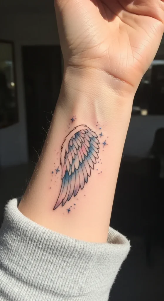 This inner wrist tattoo showcases a single angel wing rendered with fine black outlines and a soft watercolor gradient. The color palette blends dreamlike shades of sky blue, soft lavender, and hints of blush pink throughout the feathers. Tiny blue stars and delicate dots surround the wing, giving it a celestial glow that makes the whole piece feel like it’s floating. It’s a medium-sized design that perfectly fits the natural curve of the forearm, balancing clean lines with a whimsical and airy feel.