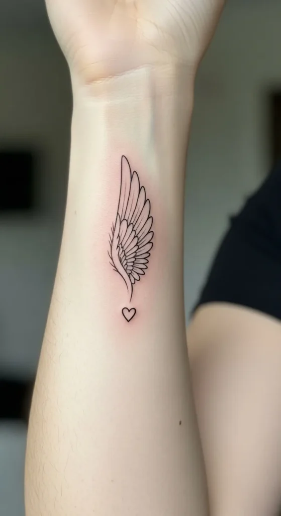 I honestly think this is the perfect way to honor someone special or a personal journey without going overboard. The way the heart sits right at the pulse point feels so intentional and sweet. It is exactly the kind of tattoo that catches your eye when you are typing or grabbing a coffee, and just gives you a little boost of peace. I am a huge fan of how it balances that bold wing detail with the simple heart because it feels both powerful and soft at the same time.
