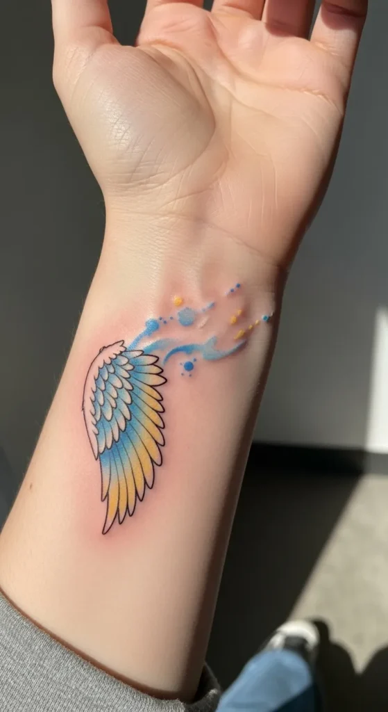 This inner wrist tattoo showcases a single angel wing blending a soft yellow gradient into a vibrant sky blue. The design is framed by a clean black outline that gives the feathers some great definition against the skin. What makes it unique is the trail of watercolor splashes and tiny dots that float upward toward the hand. It looks like the wing is literally dissolving into stardust or a light breeze. The size is perfect for the wrist area since it follows the natural curve of the arm without feeling too bulky for daily wear.