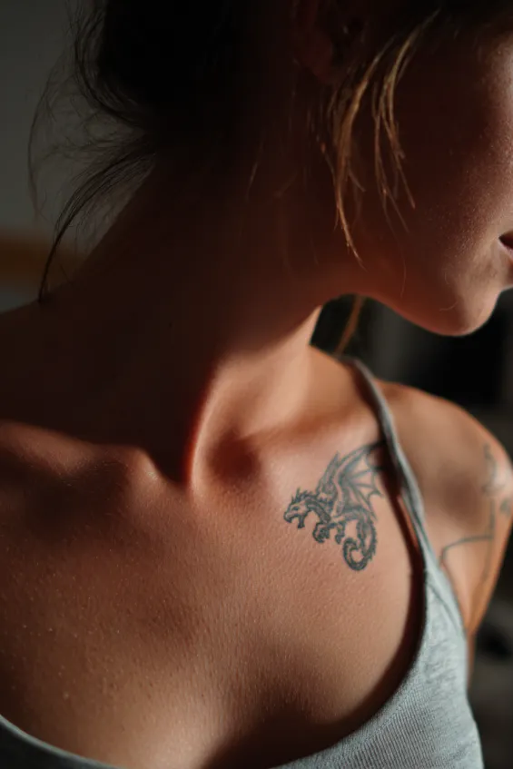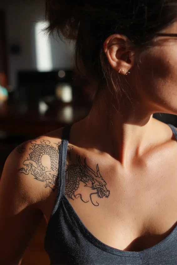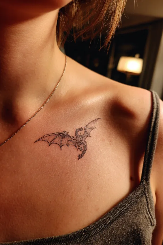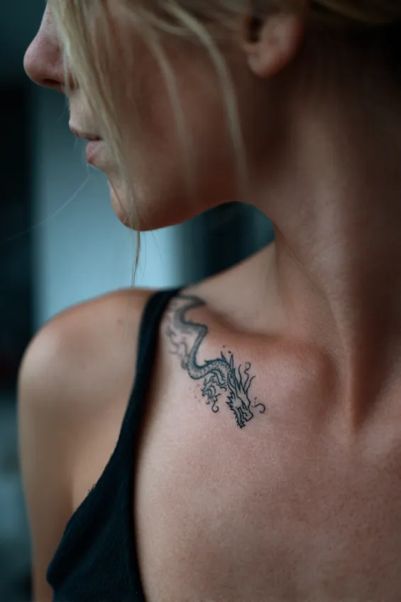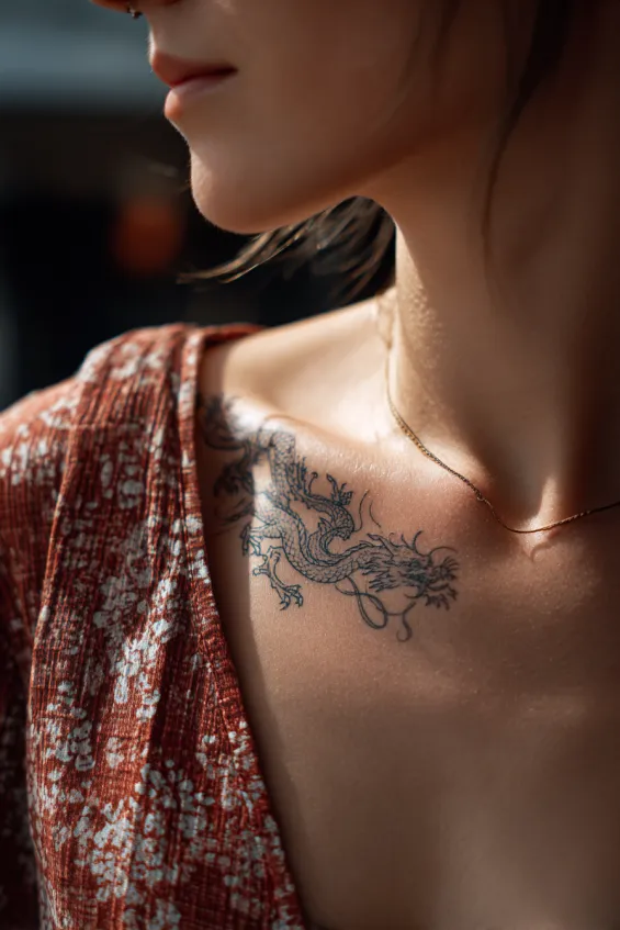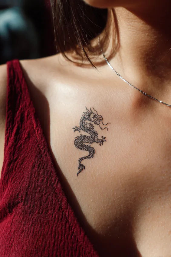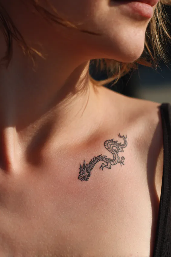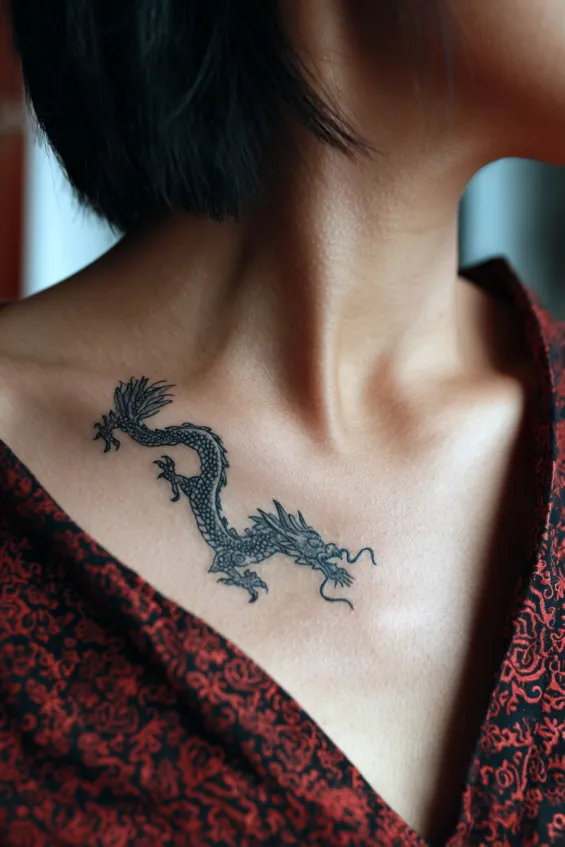 I absolutely love how this one feels romantic without trying too hard. The way the dragon stretches horizontally makes the collarbone look even more defined and feminine. It gives off that quiet confidence energy that I personally adore in a tattoo.