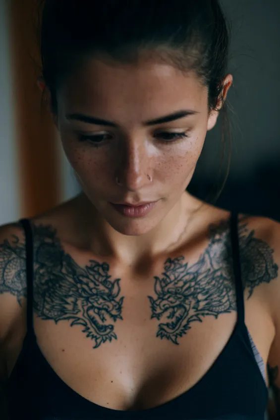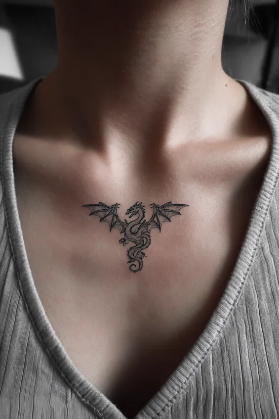 This design features two fine line dragons mirrored across both collarbones, meeting near the center of the chest. The lines are delicate yet slightly more detailed, with subtle shading that adds depth while keeping the overall look refined. The size leans toward medium but remains balanced and feminine.