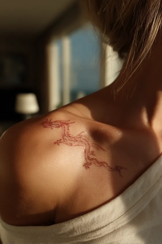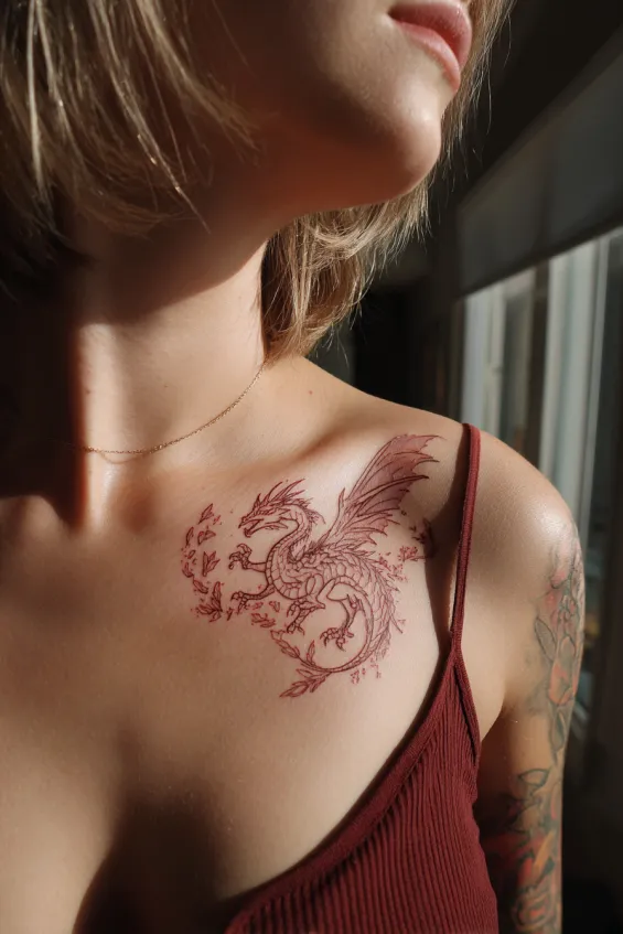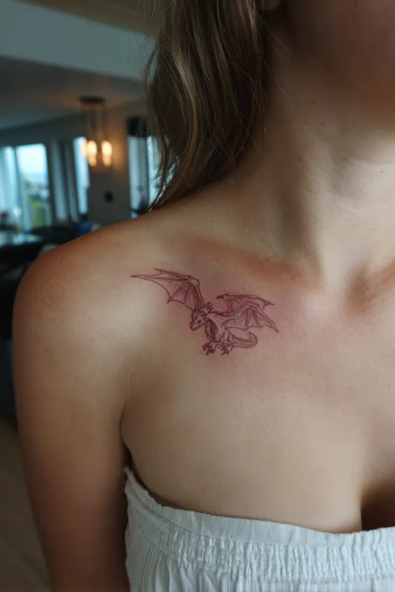 Here we see a medium sized fine line dragon placed diagonally along the collarbone of a woman wearing a deep red top. The dragon’s body flows in an S shape with light dotwork accents that add texture without making it heavy. The ink is classic black and softly healed.