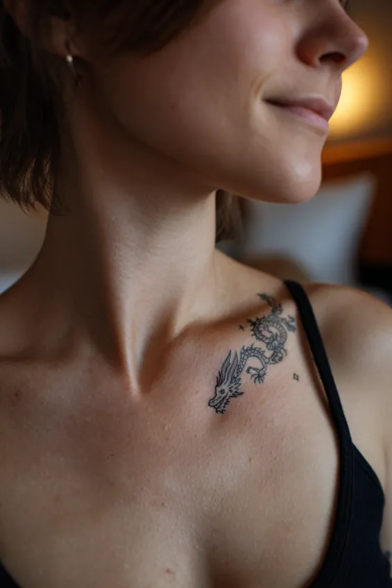 I think side placements like this are so flattering. They frame the neckline in a quiet way and feel a little flirty without trying too hard. If you like the idea of a dragon that feels personal and not overly bold, this is such a charming option.