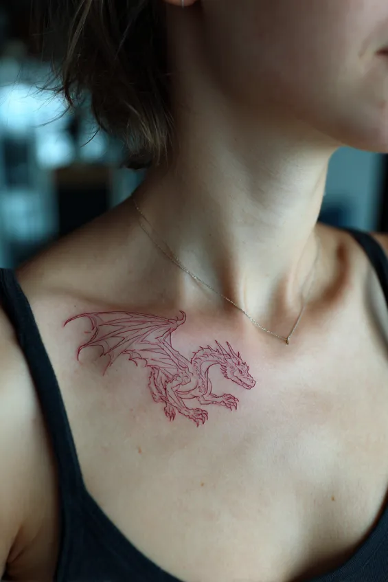 This medium sized fine line dragon stretches across the upper chest near the collarbone in a muted red tone. The wings are extended with thin, graceful lines that create a sense of openness and lightness. The body curves naturally with the bone structure, making the placement feel intentional and balanced.