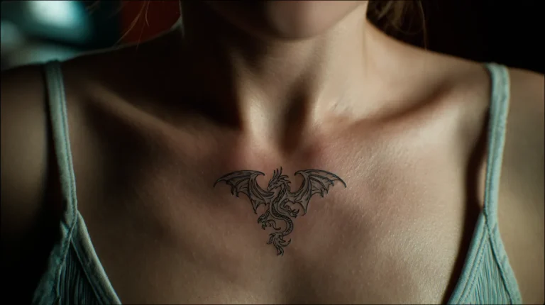 I love vertical placements like this because they elongate the neckline in such a pretty way. It feels dainty but still strong, which is honestly my favorite combination for a dragon tattoo.