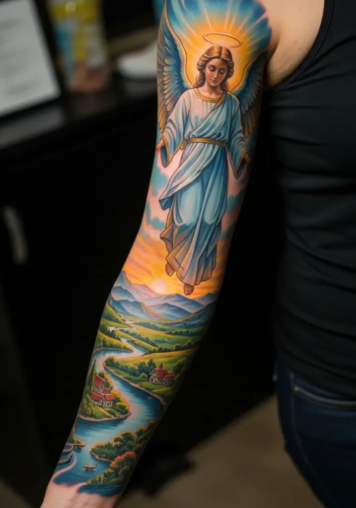This full sleeve shows an angel rising above a detailed landscape, blending heavenly imagery with earthly elements in vibrant color.