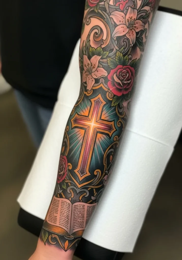 This full sleeve features a glowing cross surrounded by richly colored roses and ornamental detailing.