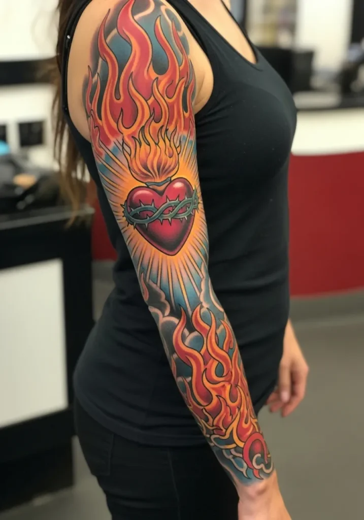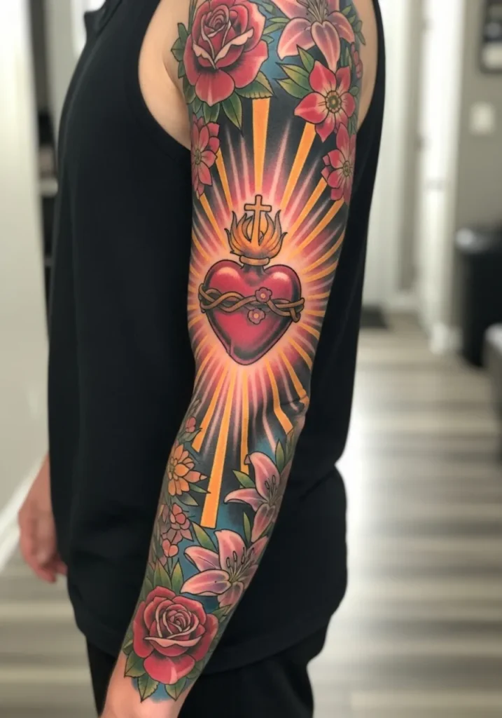 This bold sleeve centers on a vivid sacred heart surrounded by flames, light rays, and rich saturated color.