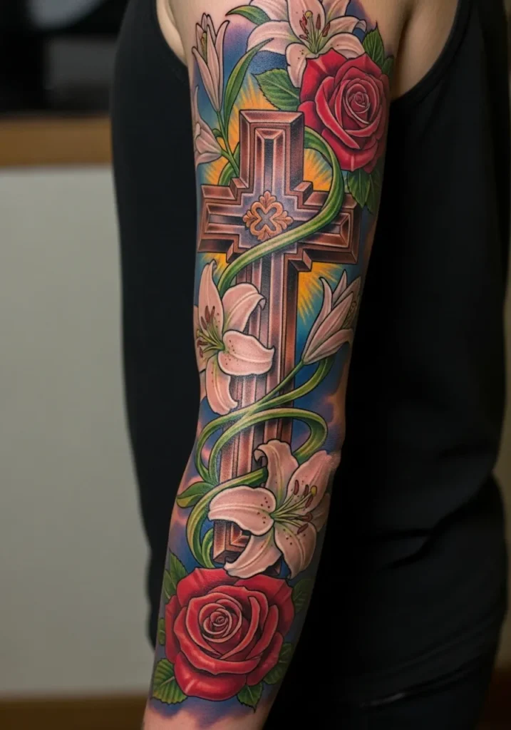 This full sleeve features a tall ornate cross woven with blooming roses, green vines, and soft glowing accents that run from shoulder to wrist.