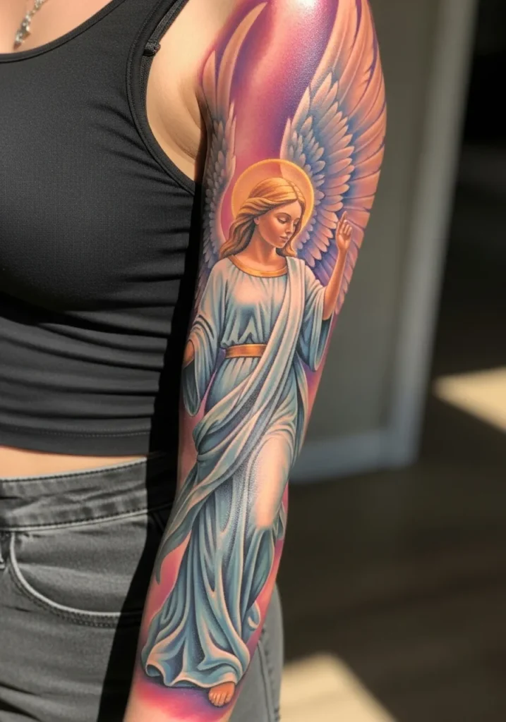 This full sleeve features a graceful angel rendered in vivid color realism, stretching elegantly down the arm with flowing robes and softly detailed wings.