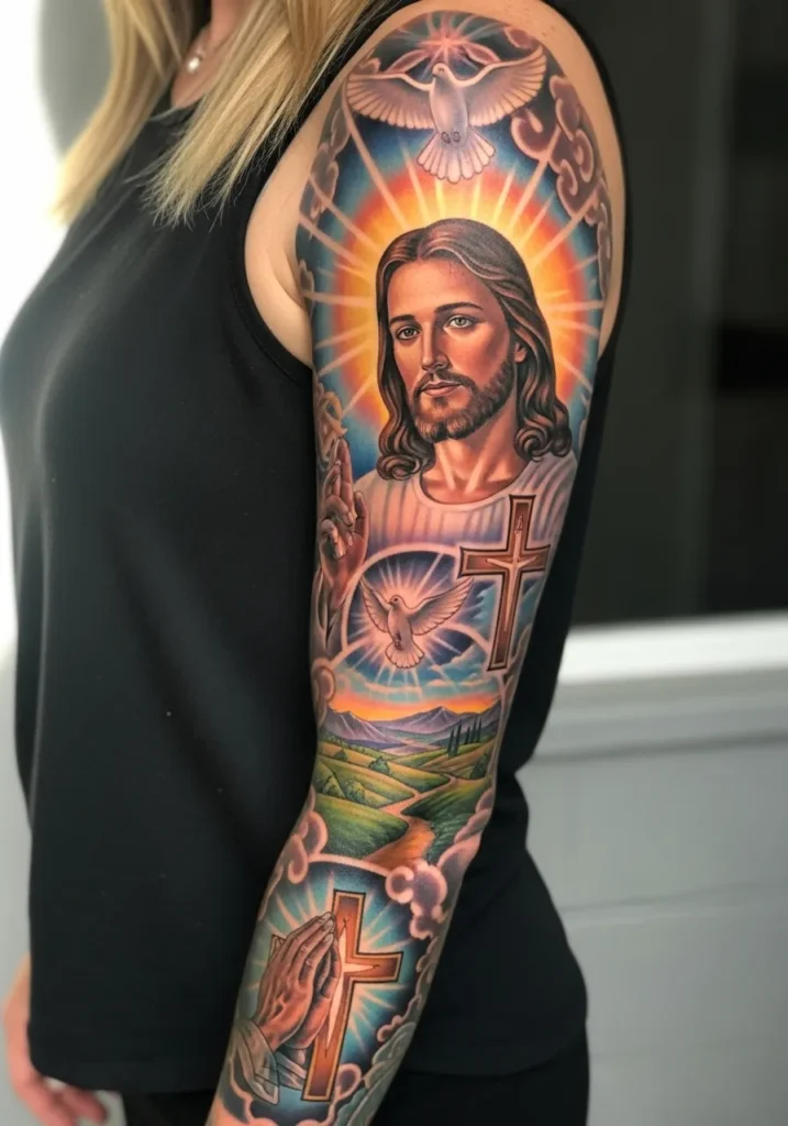 I have always loved how a full sleeve tattoo can tell a complete story, especially when faith is woven into every detail.