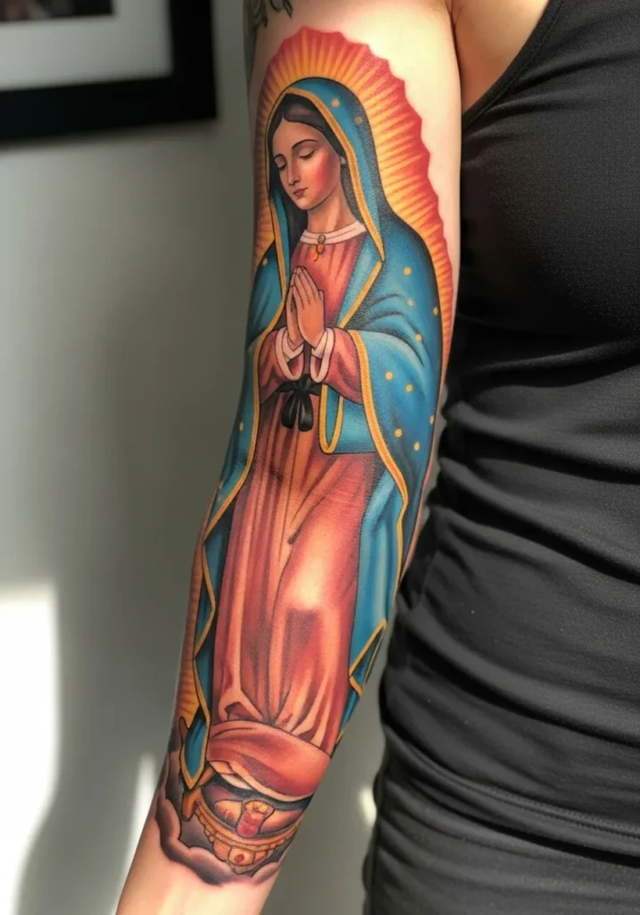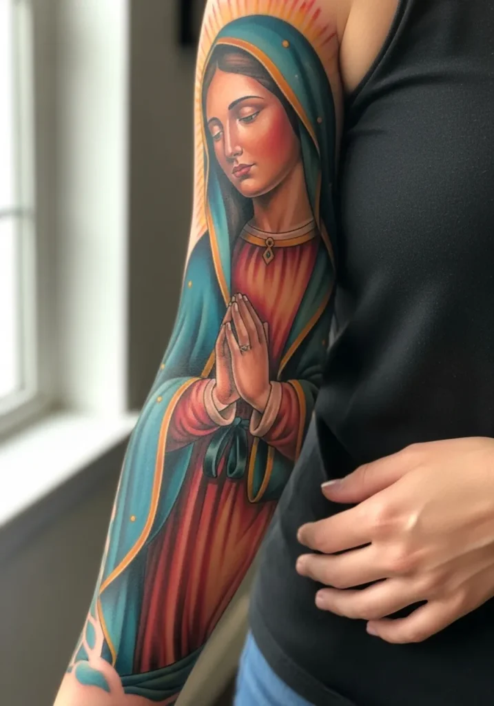 This full sleeve showcases the Virgin Mary in a prayerful pose, with rich reds and blues layered over soft golden accents.