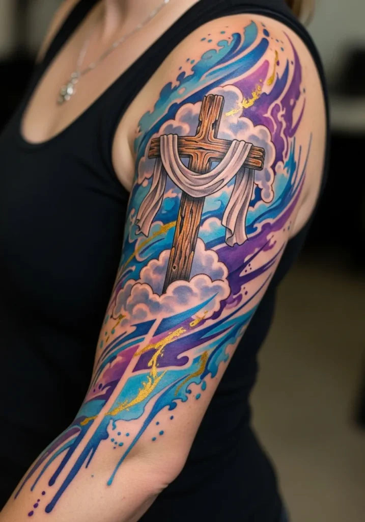 This full sleeve blends a glowing cross with swirling clouds and sky elements in rich blues and warm light tones.