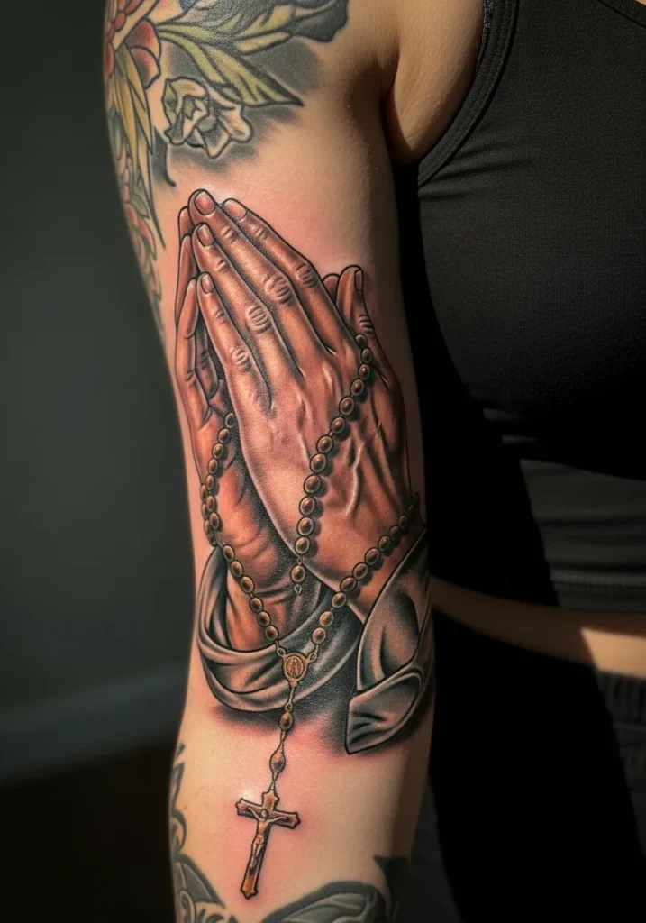 This full sleeve focuses on detailed praying hands holding a rosary, rendered in warm earthy tones with subtle highlights.