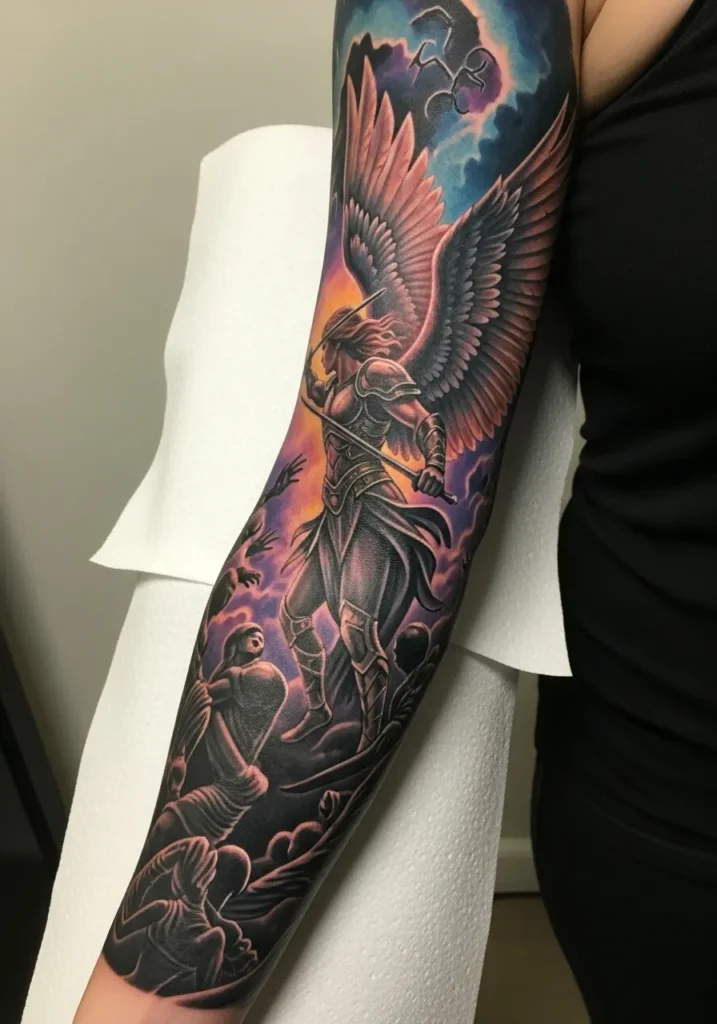 This full sleeve showcases a powerful guardian angel dressed in detailed armor, surrounded by swirling clouds and glowing light.