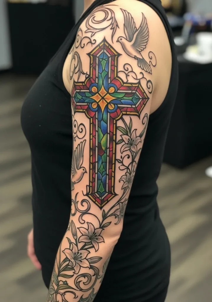 This full sleeve centers around a colorful ornate cross, framed by delicate floral filigree that flows from the shoulder down the arm.