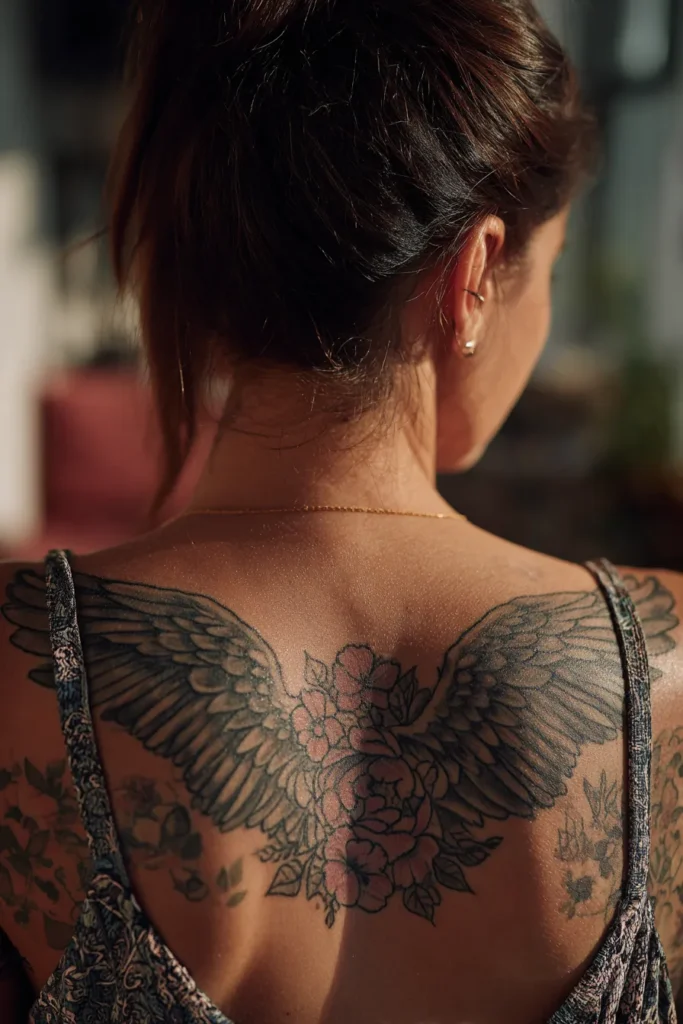 I’m a huge fan of how this combines the strength of angel wings with the softness of a blooming garden. It feels like a beautiful way to represent growth and protection all in one go. To me, the way the wings seem to sprout directly from the flowers makes the whole design feel alive and organic. It is the perfect choice if you want something that feels feminine but still makes a bold statement whenever you wear a backless top.