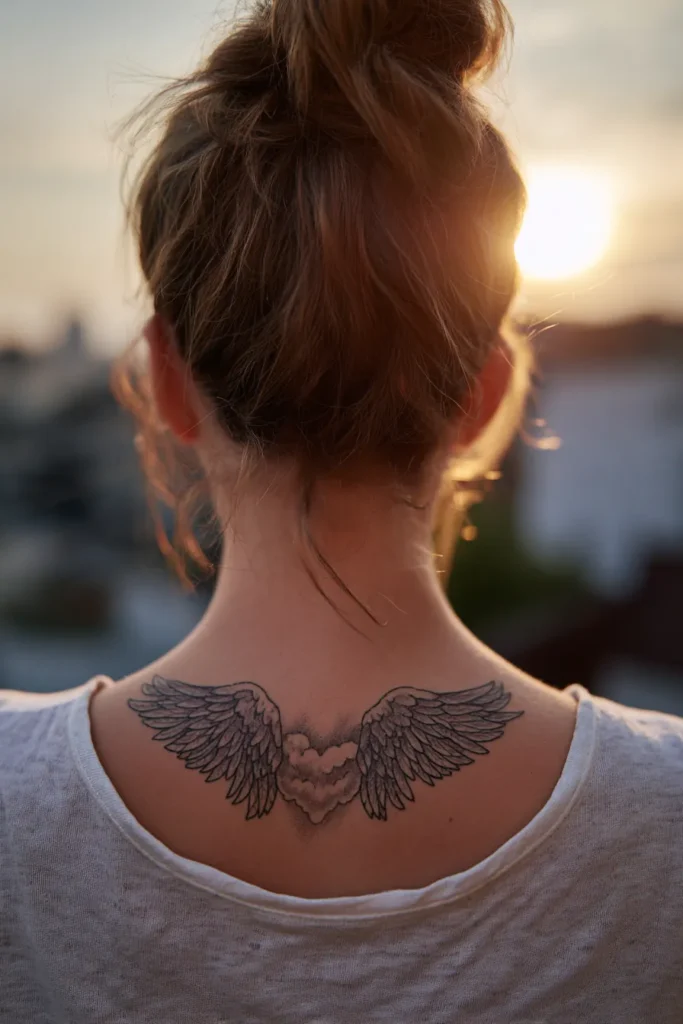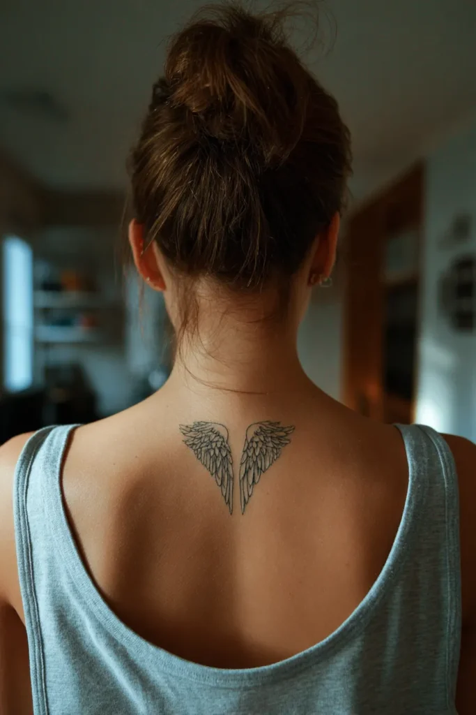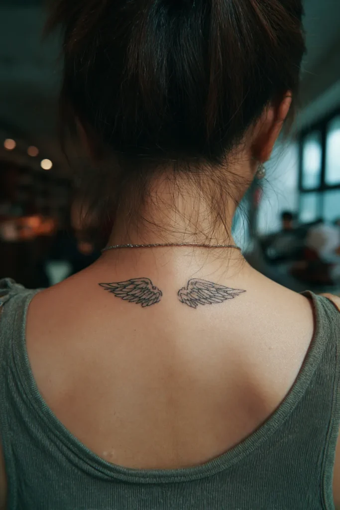 This piece features two small and intricately detailed angel wings placed perfectly at the base of the neck. The style is classic fine-line work with soft grey shading that gives the feathers a light and airy texture. It is a dainty design that spans just a few inches across the upper back, so it stays dainty rather than overwhelming. The ink is a soft black and charcoal mix, which makes the tattoo look like a graceful sketch on the skin rather than a heavy stamp.