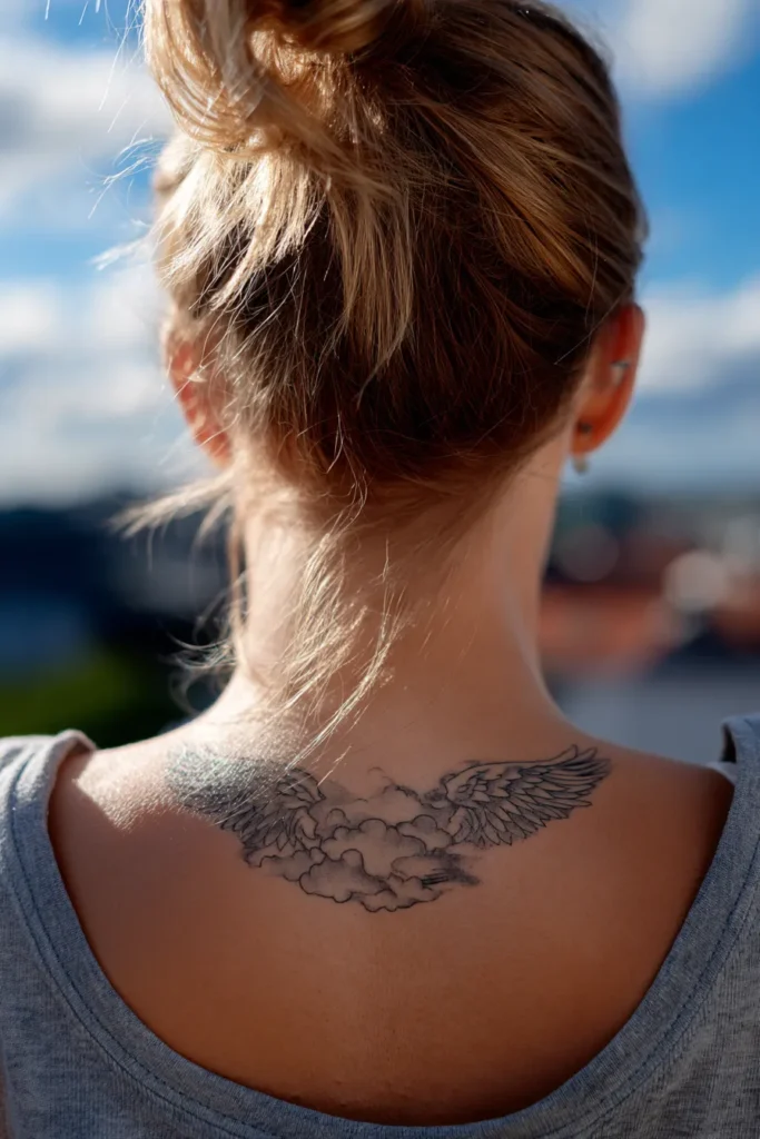This upper back tattoo showcases a pair of detailed angel wings cradling a cluster of fluffy clouds right at the base of the neck. The piece is done in a fine line black and grey style with delicate shading that gives the feathers a realistic texture. It spans across the shoulder blades in a horizontal layout that feels both balanced and intentional. The soft grey wash used for the clouds creates a lovely contrast against the sharper linework of the wings, making the whole design look like it is floating right on the skin.