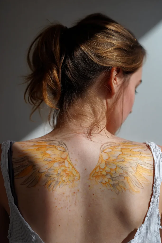 This watercolor-style piece spans across the upper back and shoulders with a delicate and airy feel. Instead of heavy black outlines, the design uses soft grey sketches to define the feathers, which are filled with a glowing palette of marigold, amber, and soft honey tones. The wings are medium in size and sit perfectly along the shoulder blades, giving the impression that they are catching the light of a setting sun. The artist added subtle splatters of golden pigment around the edges to create a dreamy, painterly effect that blends beautifully with the skin.