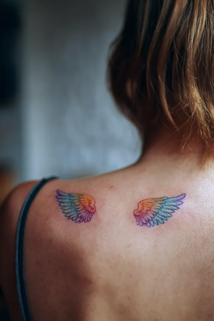 I really feel like this look is perfect for anyone who wants to show off their colorful personality without committing to a massive back piece. There is a playful and magical energy here that reminds me of childhood dreams or a favorite fairy tale. I enjoy how the rainbow palette makes the classic angel wing motif feel fresh and modern. It is the kind of design that makes me smile every time it peeks out from a summer dress.
