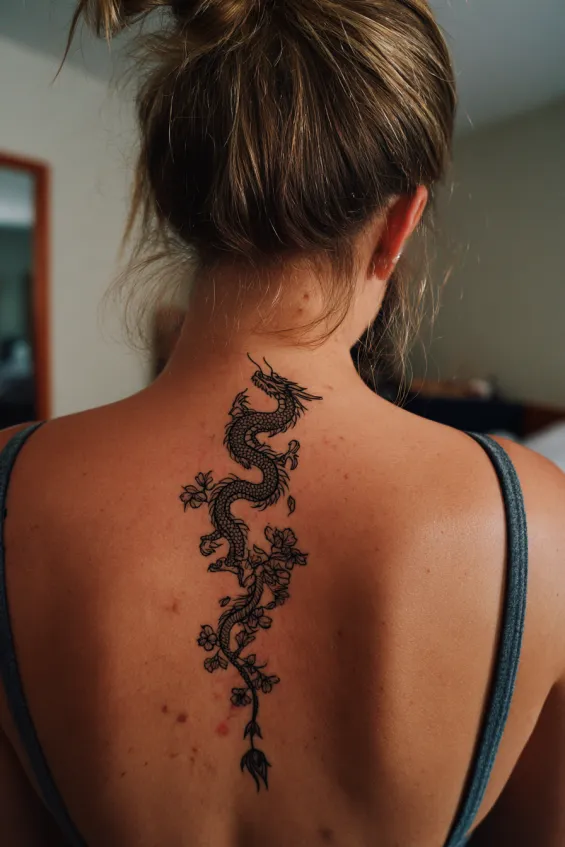 A slim black ink dragon flows gracefully down the center of a woman’s upper back, perfectly aligned with her spine. The design is medium sized and vertical, with fine line detailing that gives the dragon a soft and elegant silhouette. Tiny floral accents are woven into the body, adding a subtle botanical touch without overpowering the composition. With her hair pinned up, the entire piece is visible, creating a clean and balanced look.