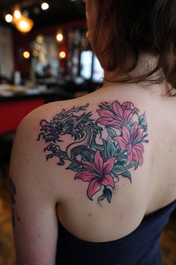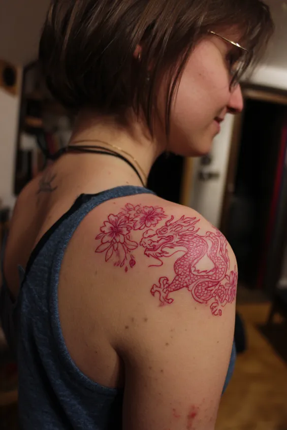 A delicate pink floral dragon rests on the upper shoulder, created with lighter and more refined linework. Blossoms cluster around the dragon’s body, enhancing the dreamy, nature inspired feel. The size is moderate, making it noticeable yet still soft.