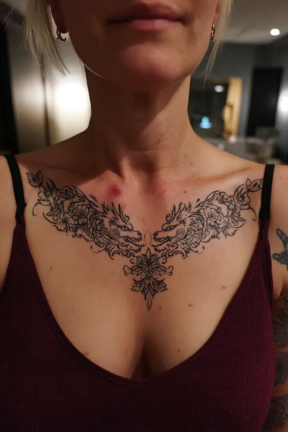 An intricate floral dragon spreads gracefully across the upper chest just below the collarbones. The composition feels almost symmetrical, with detailed linework that resembles delicate lace. The fine details give it a jewelry inspired effect that frames the neckline beautifully.