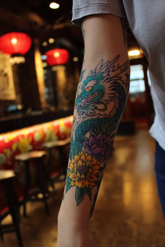 A vibrant dragon curves along the forearm, intertwined with bright yellow sunflowers and lush greenery. The bold blues and greens of the dragon contrast beautifully with the warm petals, creating a lively and eye catching composition. The medium size keeps it balanced while still making a statement.