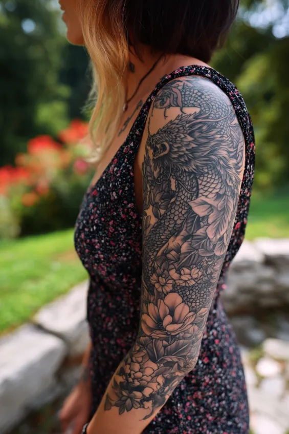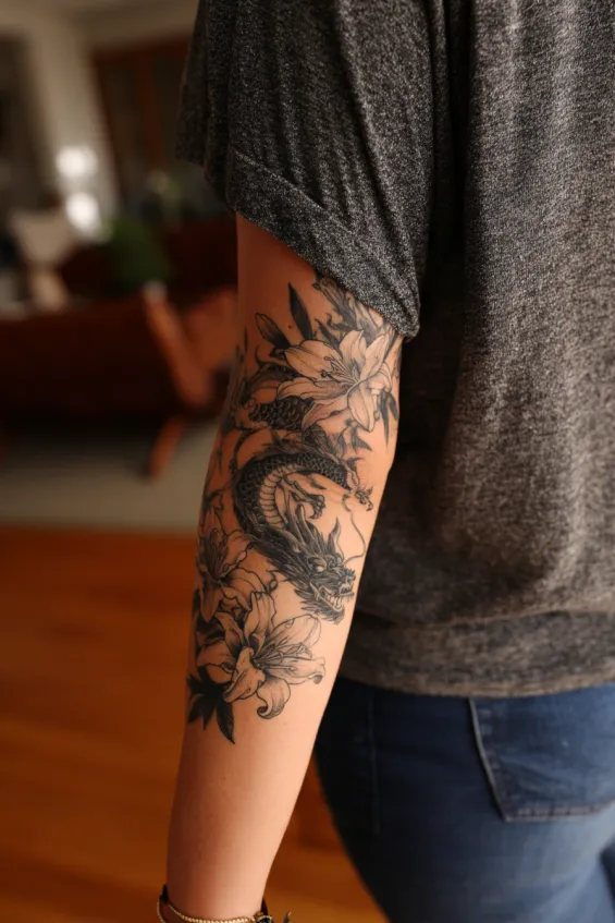 An entire arm is transformed into a black and grey floral dragon sleeve, layered with blossoms and winding scales from shoulder to wrist. The shading creates depth in both the petals and the dragon’s body, giving the design a rich, textured finish. The movement flows naturally with the arm, making it feel cohesive and intentional.